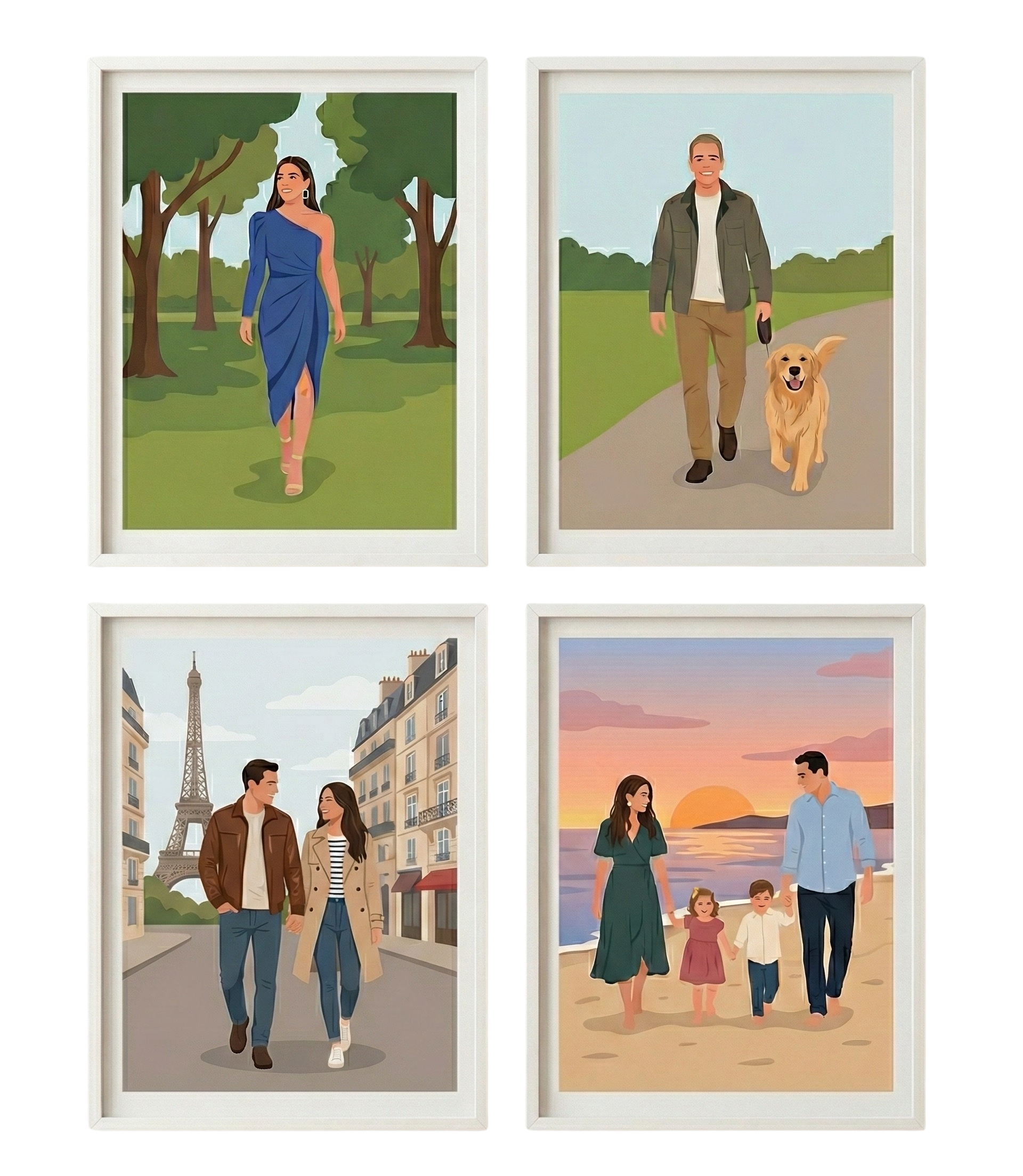 Ilustramos personas, parejas, familias y mascotas a partir de fotografías, cuidando cada detalle para transformar